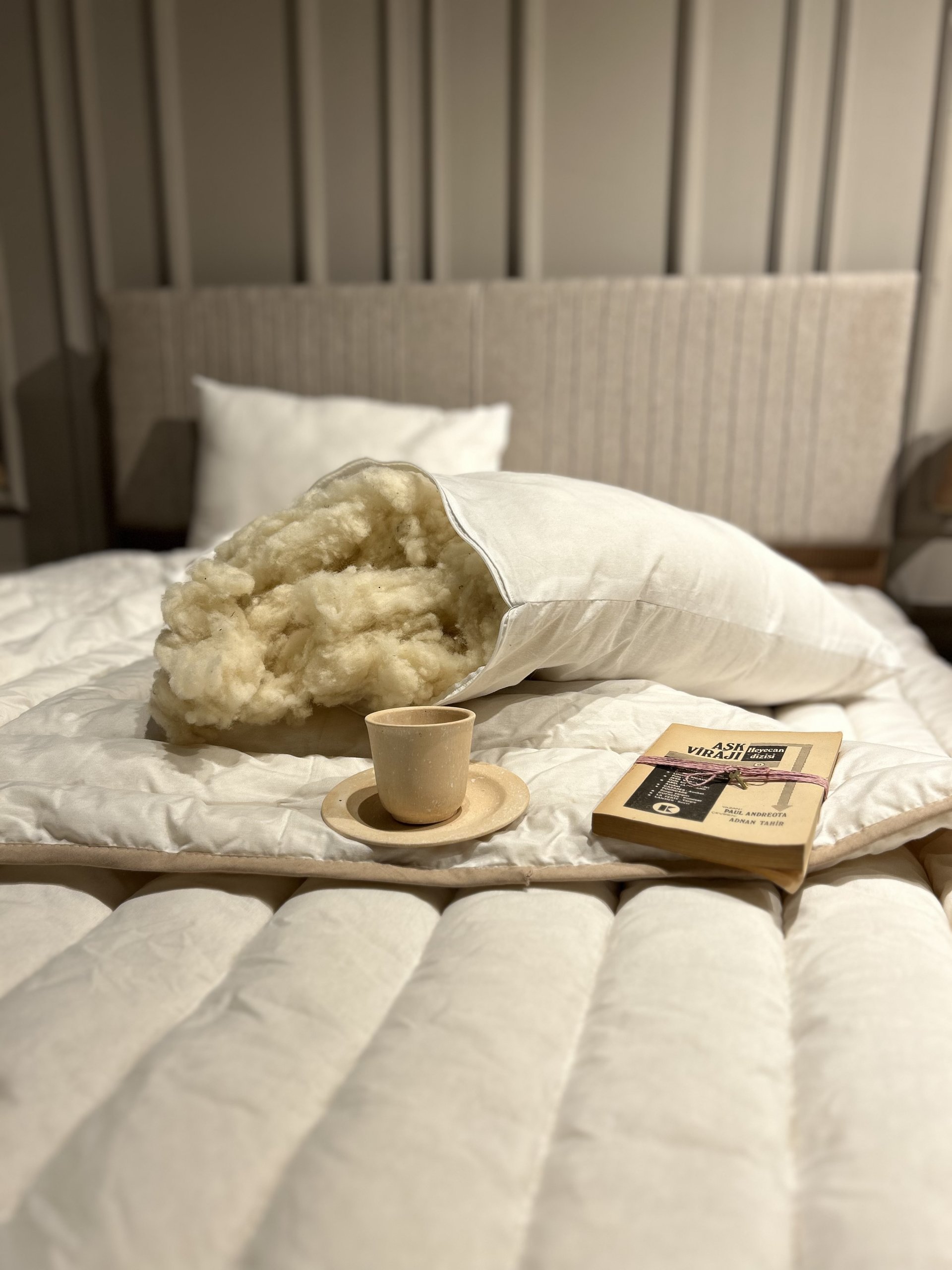 - Malzeme: %100 doğal Merinos kuzu yünü, saf pamuklu dış yüzey.