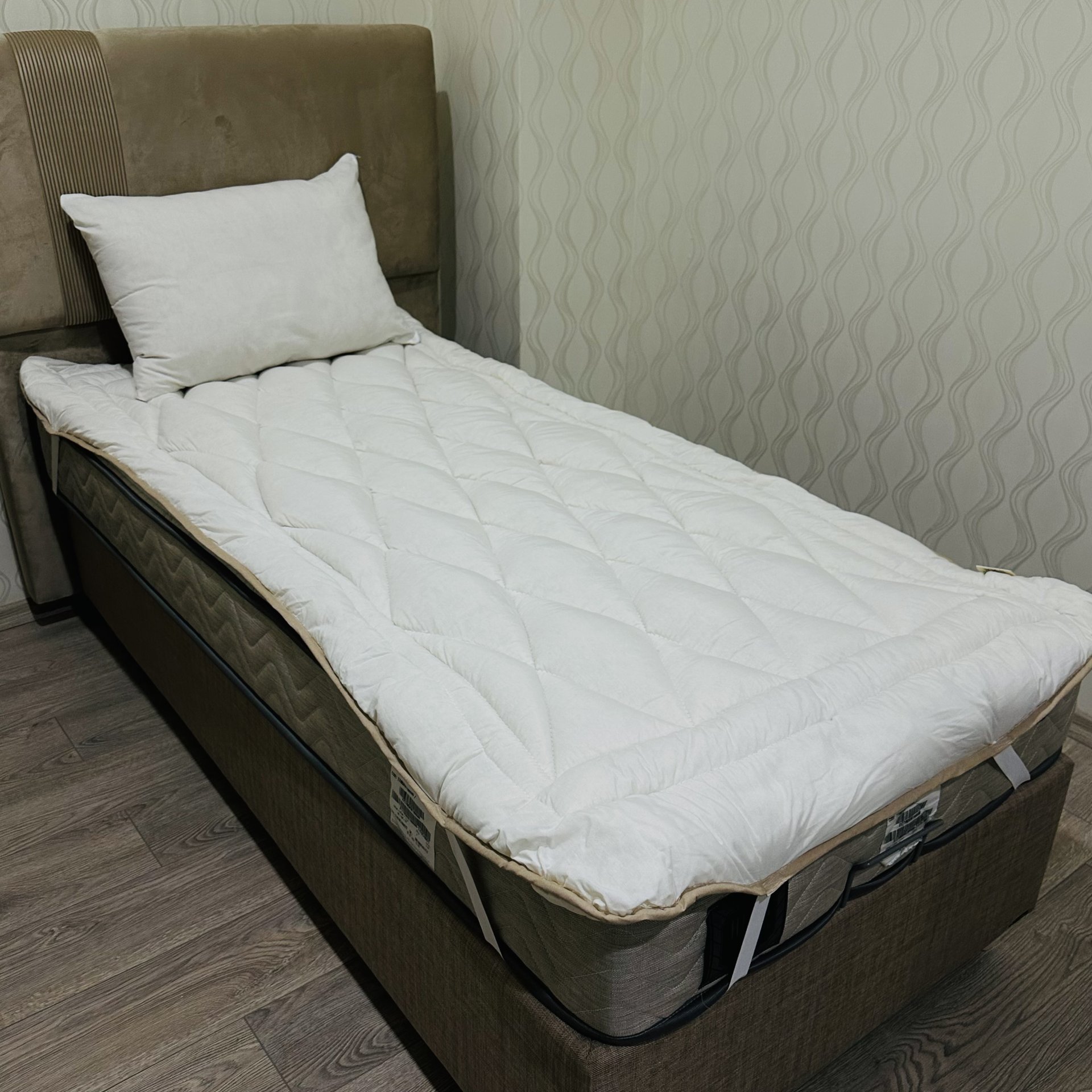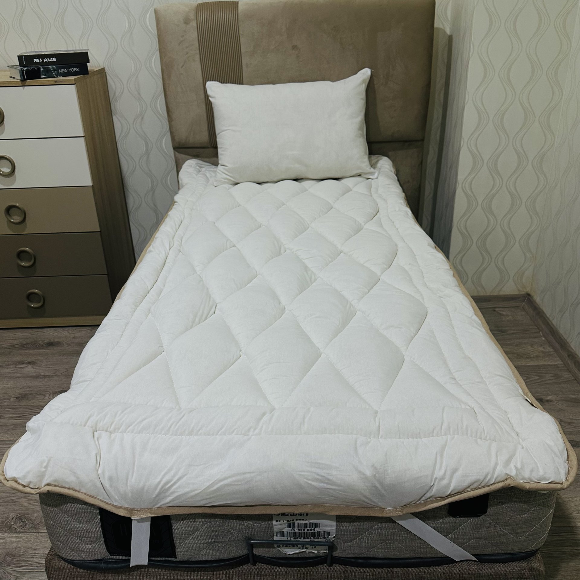 Doğal malzemelerle hazırlanmış, konforlu ve sağlıklı bir uyku için ideal set: Tek kişilik yorgan, yumuşak yatak pedi ve bir adet yastık ile tam bir rahatlık paketi sizi bekliyor.